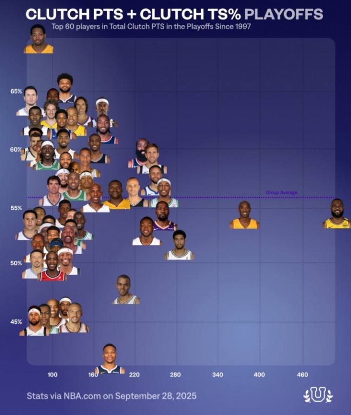 直播吧9月29日讯近日,数据媒体NBAUniversity总结了自从1997年以来(NBA官网该项数据统计起始时间)在NBA季后赛中关键得分前60球员的真实命中率分布图表。